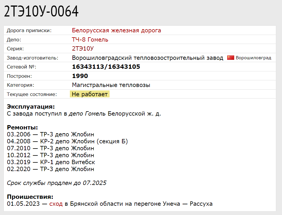 • По уточнённой информации тепловоз, подорванный на 136 километре перегона Унеча — Рассуха, серии 2ТЭ10У №064 (сетевой №:16343113/16343105). Депо приписки: ТЧ-8 Гомель Белорусской железной дороги.