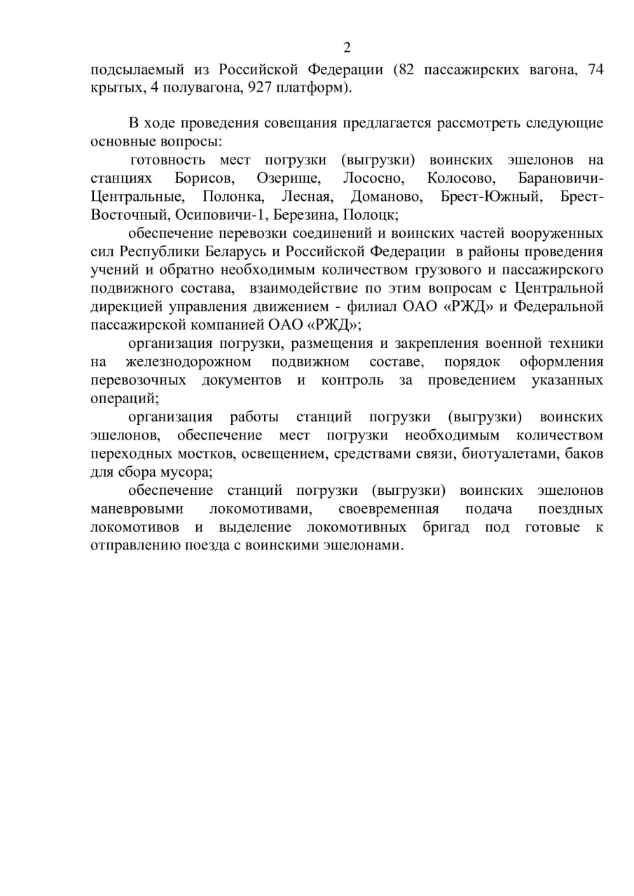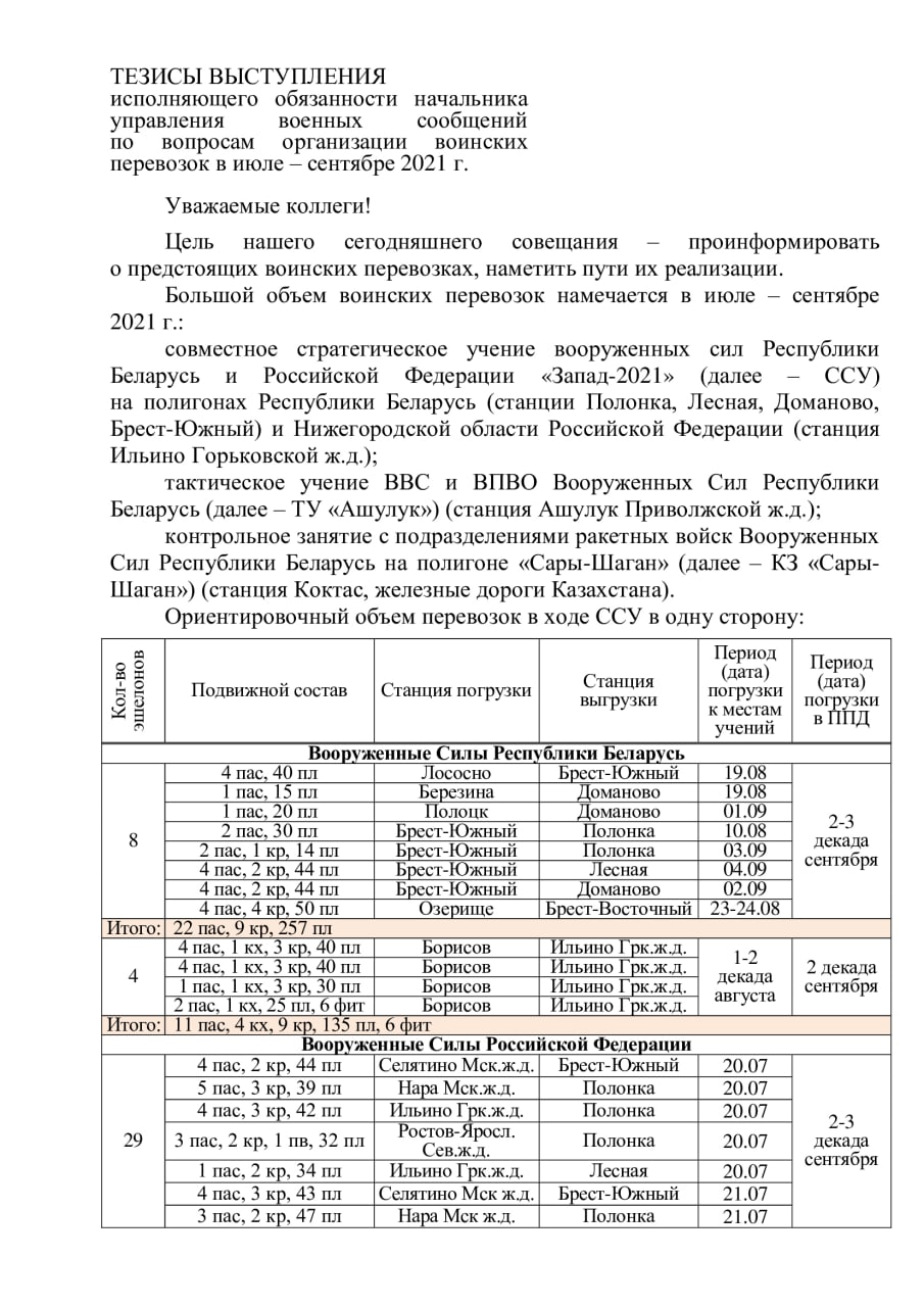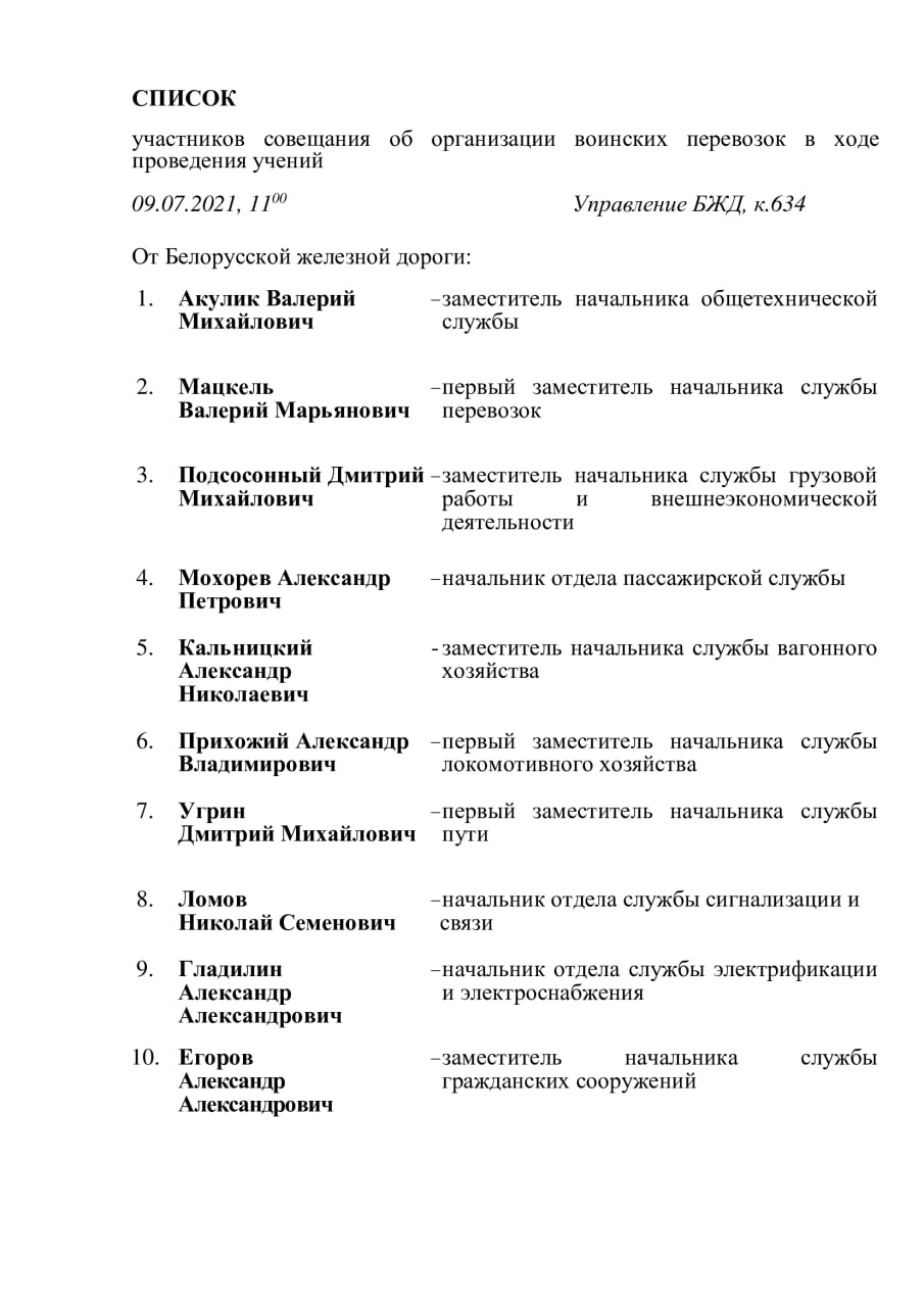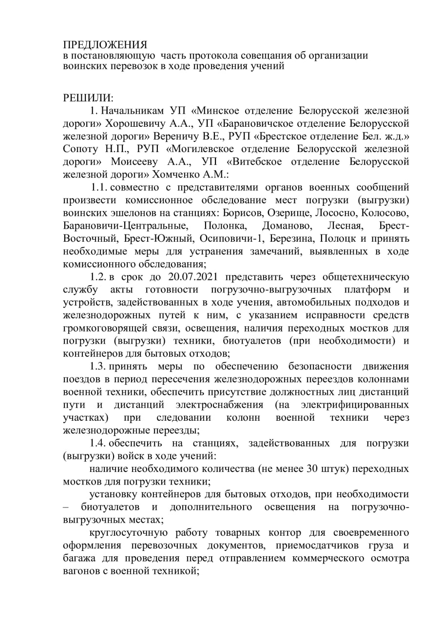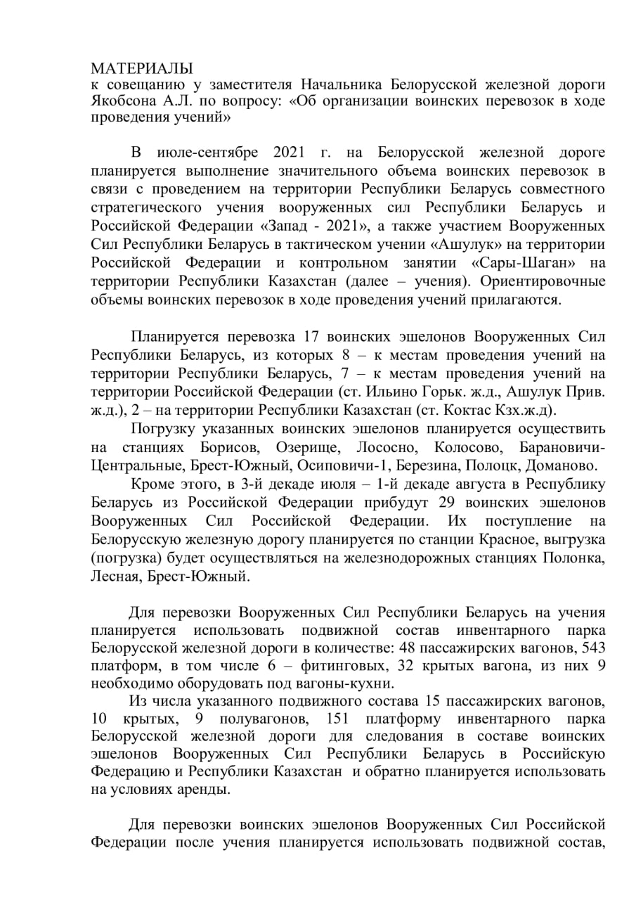 2) Материалы к совещанию у заместителя Начальника Белорусской железной дороги Якобсона Андрея Львовича по вопросу об организации воинских перевозок в ходе проведения учений «Запад — 2021». Предложения в постановляющую часть протокола совещания об организации воинских перевозок в ходе проведения учений: