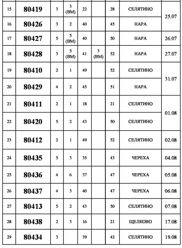 19. № 80410 Селятино Моск. – Лесная БЧ (состав 52 вагона), 01.08.2021 Красное 15.50 (п. №2135), Госгр. (САИПС Красное) 15.53, Орша-Центр. 16.40-19.13 (п. №2125), Минск-Сорт.(П.№3,4) 00.07-01.00 (п.№2601), Барановичи-Ц.(МП) 03.26-03.28, Лесная 04.00;
