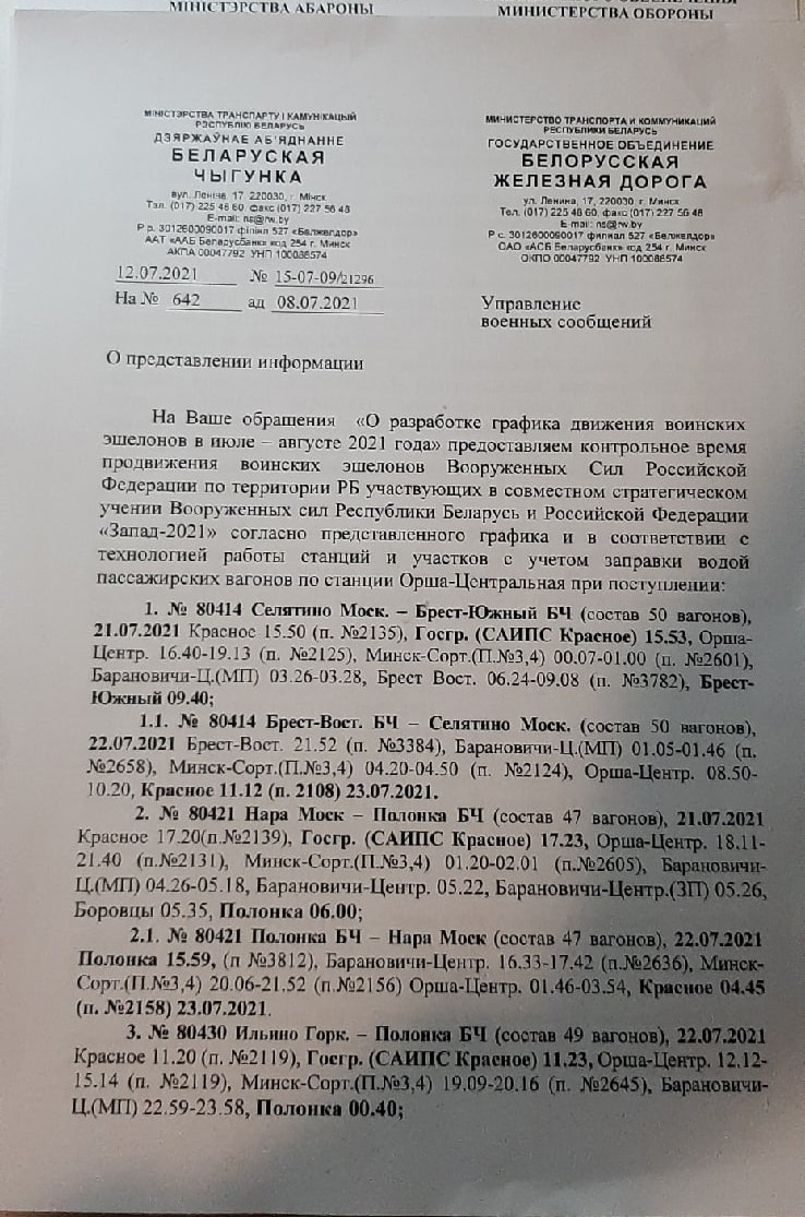 ❗️В дополнение: подтвердилась информация от коллег с ОАО «Российские железные дороги», что в августе 2020 года были разработаны графики движения воинских эшелонов в Республику Беларусь, на случай «обострения» ситуации в стране.