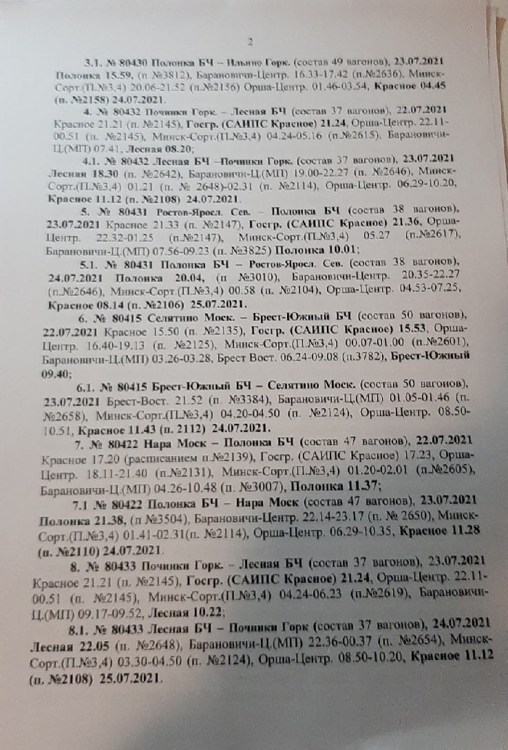 22.1. № 80420 Брест-Южный БЧ – Селятино Моск. (состав 50 вагонов), 03.08.2021 Брест-Вост. 17.03 (п. №2646), Барановичи-Ц.(МП) 20.38-22.56 (п.№2648), Минск-Сорт.(П.№3,4) 01.20 (п. №2106), Орша-Центр. 05.08-07.25, Красное 08.14 (п. 2106) 04.08.2021.