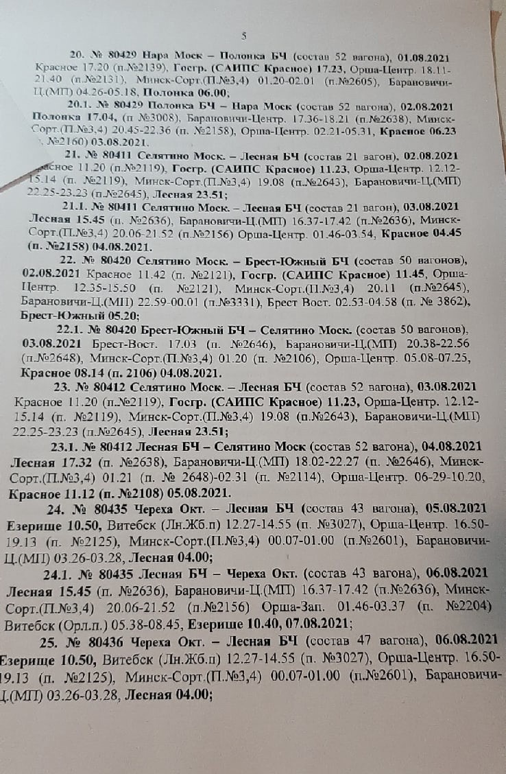 24. № 80435 Череха Окт. – Лесная БЧ (состав 43 вагона), 05.08.2021 Езерище 10.50, Витебск (Лн.Жб.п) 12.27-14.55 (п. №3027), Орша-Центр. 16.50-19.13 (п. №2125), Минск-Сорт.(П.№3,4) 00.07-01.00 (п.№2601), Барановичи-Ц.(МП) 03.26-03.28, Лесная 04.00;