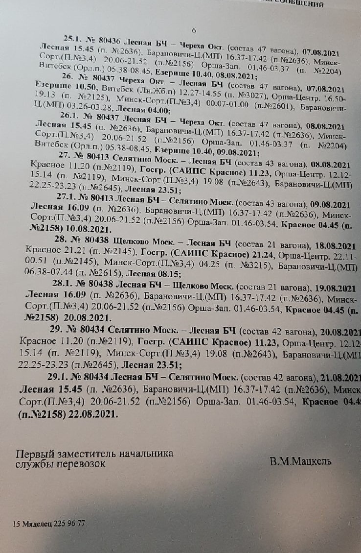 29. № 80434 Селятино Моск. – Лесная БЧ (состав 42 вагона), 20.08.2021 Красное 11.20 (п.№2119), Госгр. (САИПС Красное) 11.23, Орша-Центр. 12.12-15.14 (п. №2119), Минск-Сорт.(П.№3,4) 19.08 (п.№2643), Барановичи-Ц.(МП) 22.25-23.23 (п.№2645), Лесная 23.51;