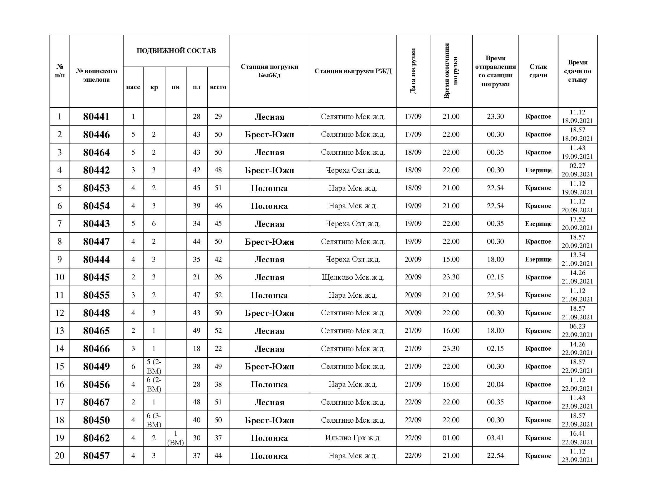 1. №80441 Лесная БЧ – Селятино Моск. (состав 29 вагонов) 18.09.2021 Лесная 23.30 (п.№2654), Барановичи-Ц.(МП) 00.03-00.37 (п. №2654), Минск-Сорт.(П.№3,4) 03.20-03.36 (п. №2120), Орша-Центр. 07.24-10.20, Красное 11.12 (п. №2108) 18.09.2021.