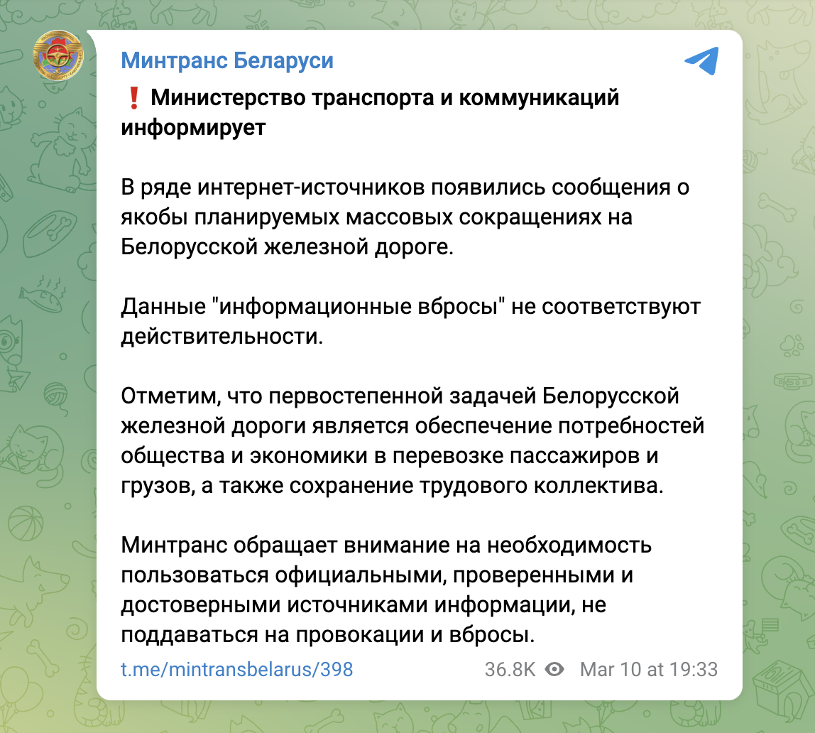 И, по сути, впервые последовала реакция от Министерства транспорта и коммуникаций Республики Беларусь — в своём Telegram-канале в срочном порядке вечером в пятницу, в день выхода нашей публикации, пресс-служба Минтранса опубликовала «опровержение». В нём даны заверения, что первостепенной задачей БЖД является обеспечение потребностей общества и экономики в перевозке пассажиров и грузов, а также сохранение трудового коллектива…